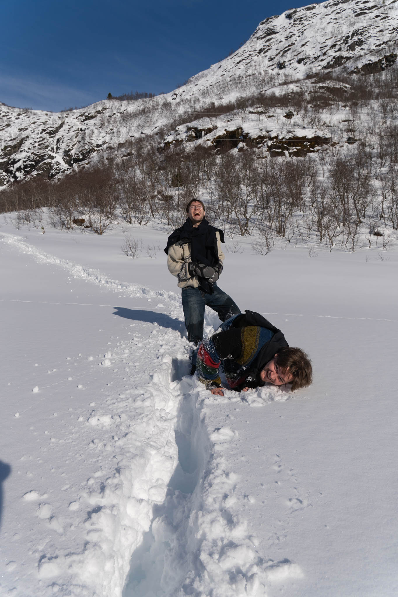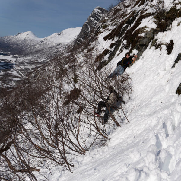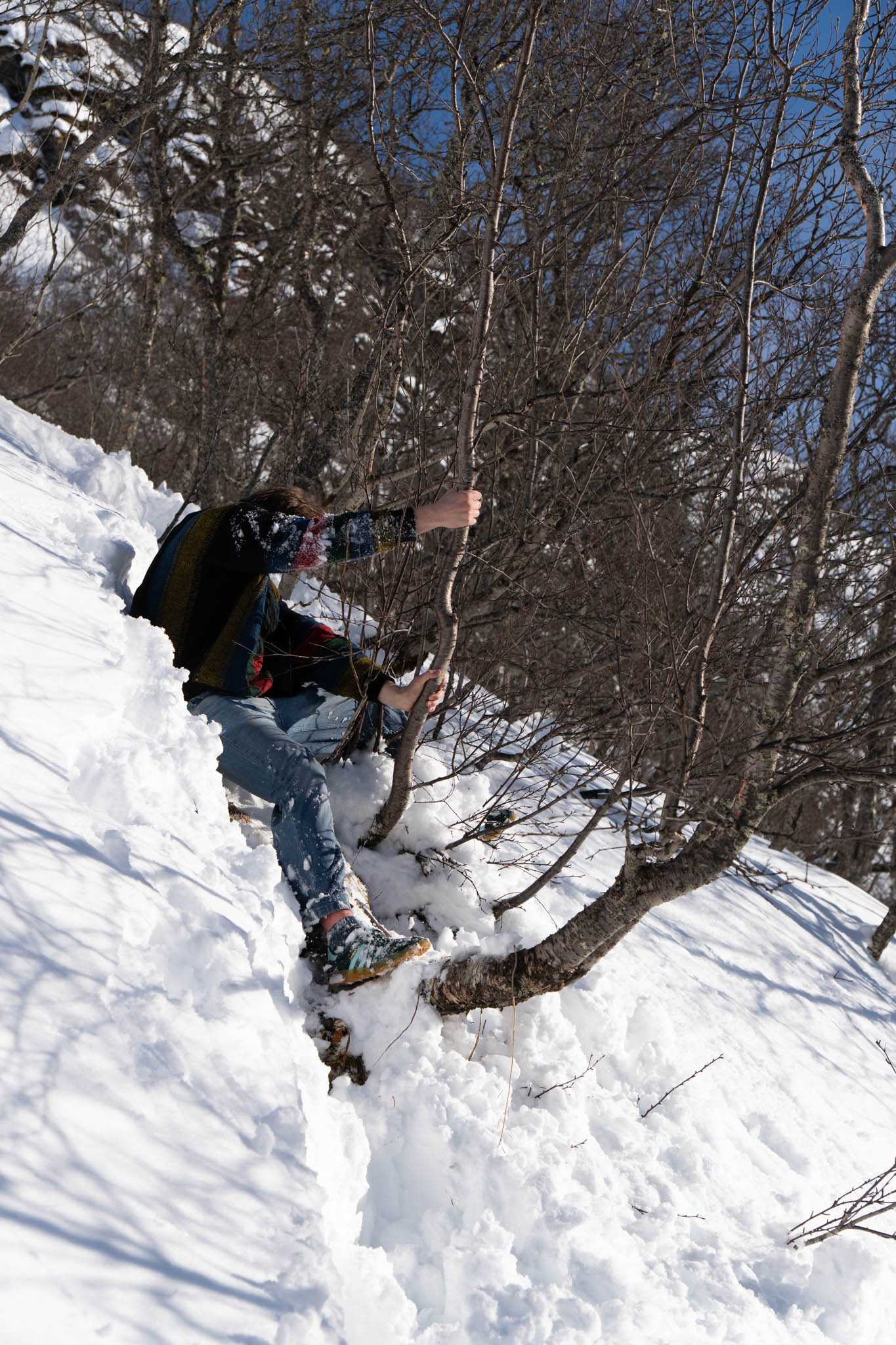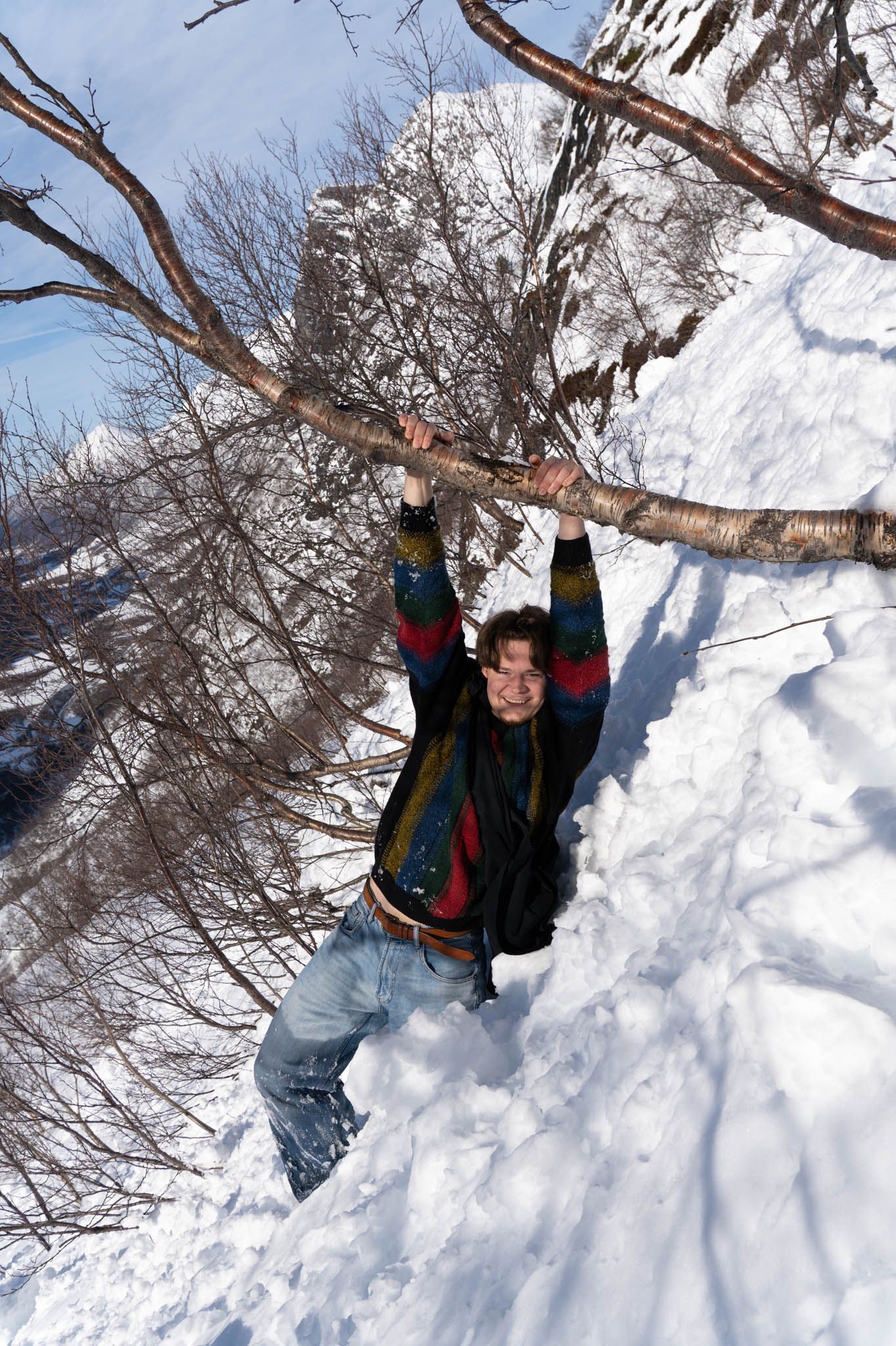 Also bin ich (als einziger nicht in Jeans) vorgegangen und habe einen „Weg“ für meine Brüder geformt. Da wir keinen anderen Weg finden konnten sind, wir einfach querfeldein gegangen. Voran kamen wir aber nur seeehr langsam. Der Schnee ging die meiste Zeit bis zur Hüfte und jeder Schritt war ein richtiger Akt (zum Teil war es so Steil, das Tim mich von hinten „hochschieben“ musste). Und so haben wir uns dann auch mehr von Baum zu Baum gehangeld als zu wandern.